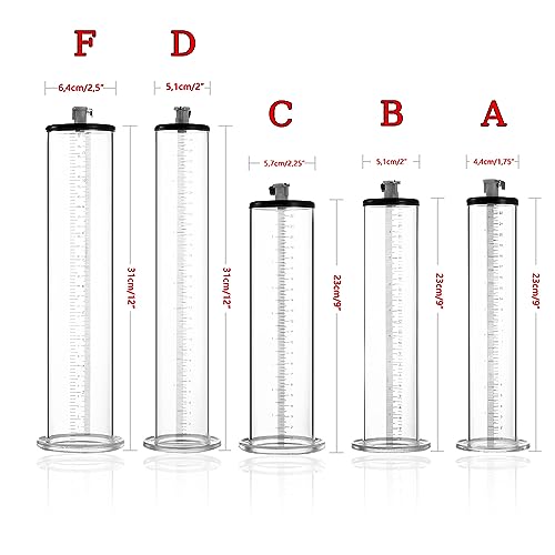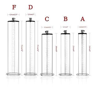 💪 Größe: Penispumpen gibt es in fünf verschiedenen Größen.A/B/C Mit einer Gesamtzylingerlänge von 23 cm und einem Innendurchmesser von 4,4/5,1/5,7 cm. D/F Mit einer Gesamtzylingerlänge von 31 cm und einem Innendurchmesser von 5,1/6,4 cm.besteht die Möglichkeit, eine unerwartete Länge und Umfang Ihres Penis zu erreichen.Hinweis: Manuelle Messdaten können einen Größenfehler von 1 bis 3 mm aufweisen. Bitte haben Sie Verständnis dafür!
