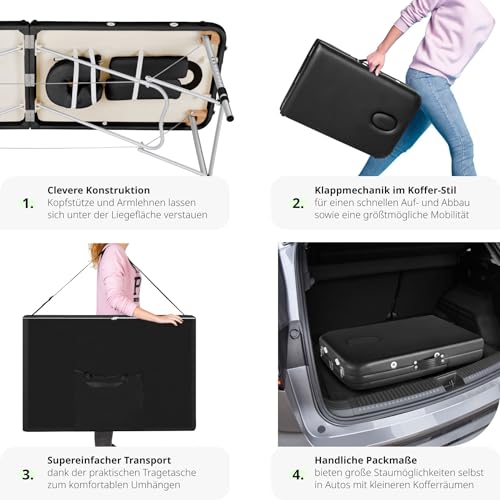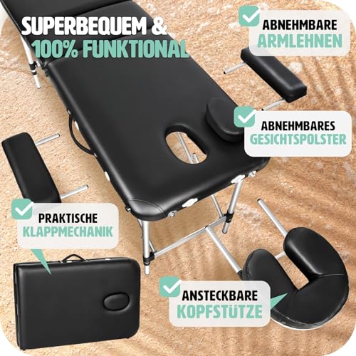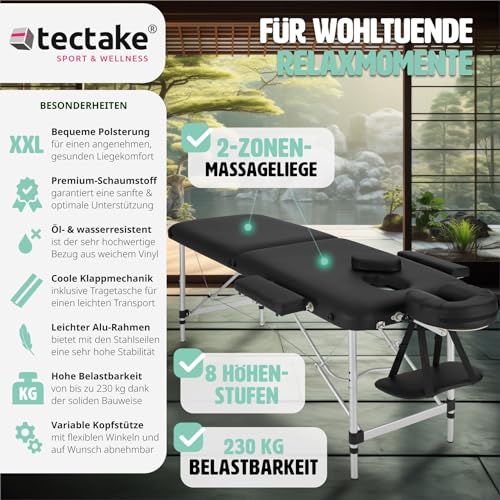 tectake Massageliege 2 Zonen, Massagetisch, Massageliege klappbar, höhenverstellbare Aluminium Massageliege, Portable Massagebank inkl. Zubehör, Alu-Kopfstütze, Armlehne und Tragetasche – schwarz